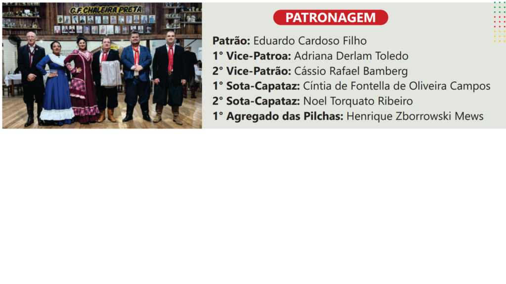 títulos com suas Escolinhas de Chula e Declamação dentro do Circuito Artístico da 9ª RT e outros rodeios artísticos pelo RS. Damos ênfase a conquista de Campeão Estadual de Chula no Festmirim 2024 e 3º lugar na Chula Juvenil no Rodeio Nacional dos Campeões pelo peão Matheus Guiotto Vieira e Alex Lopes também 3º lugar no Nacional na categoria chula vaqueano.